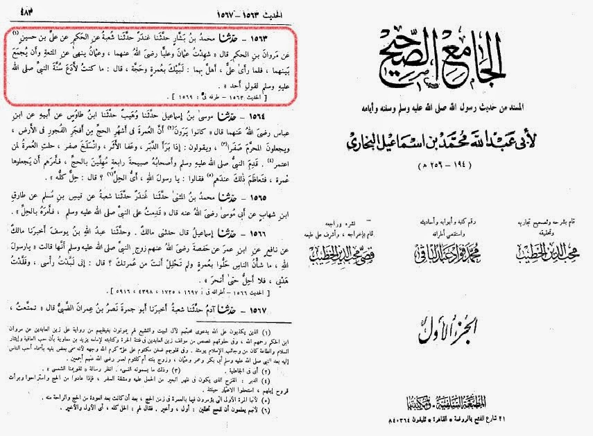 صحیح بخاری (چاپ: دار القلم بیروت – بیروت – 1407 ) کتاب الحج – باب التلبیه اذا النحدر فی الوادی – ج 1 ص 652 حدیث 1459/الشامله صحیح البخاری (مصدر الكتاب : موقع وزارة الأوقاف المصرية) کتاب الحج باب التَّمَتُّعِ وَالإِقْرَانِ وَالإِفْرَادِ بِالْحَجِّج 6 ص 130 حدیث 1563/1563 - حَدَّثَنَا مُحَمَّدُ بْنُ بَشَّارٍ حَدَّثَنَا غُنْدَرٌ حَدَّثَنَا شُعْبَةُ عَنِ الْحَكَمِ عَنْ عَلِىِّ بْنِ حُسَيْنٍ عَنْ مَرْوَانَ بْنِ الْحَكَمِ قَالَ شَهِدْتُ عُثْمَانَ وَعَلِيًّا - رضى الله عنهما - وَعُثْمَانُ يَنْهَى عَنِ الْمُتْعَةِ وَأَنْ يُجْمَعَ بَيْنَهُمَا . فَلَمَّا رَأَى عَلِىٌّ ، أَهَلَّ بِهِمَا لَبَّيْكَ بِعُمْرَةٍ وَحَجَّةٍ قَالَ مَا كُنْتُ لأَدَعَ سُنَّةَ النَّبِىِّ - صلى الله عليه وسلم - لِقَوْلِ أَحَدٍ .