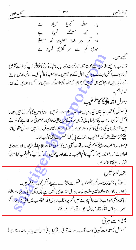 نبی ص کو اللہ نے رحمتہ للعامین بنا کر بھیجا اس لئے یہ آپ ص کی صفت ہے مگر دیوبندوں نے اس کو نبی ص کی صفت خاصہ ماننے سے انکار کر دیا۔