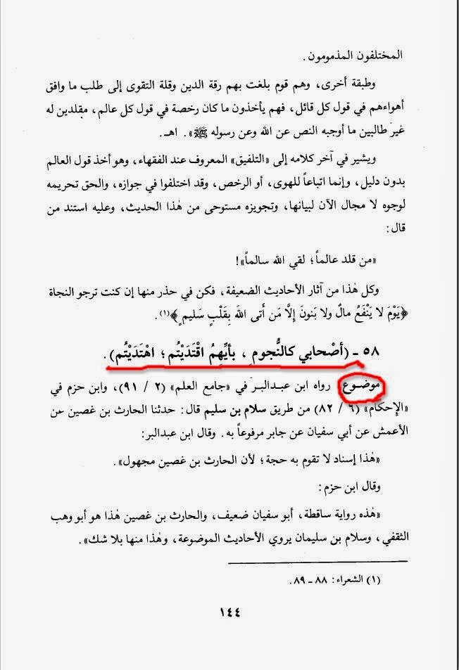 یعنی: جہاں تک اس قول کا تعلق ہے "میرے اصحاب ستاروں کے مانند ہیں جس کی بھی اقتدا ء کرو گے ہدایت تک پہونچ جاوگے"