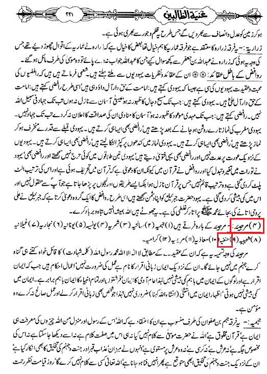شیخ عبدالقادرجیلانی جس تقریباً سارے سنی مانتے ہیں اس نے 73 فرقوں کا ذکر کیا ہے جس میں اس نے حنفیہ کو ایک جہنمی فرقے مرجئیہ کی شاخ قرار دیا ہے ۔ حنفیہ ابو حنیفہ کے ہی ماننے والوں کا گروہ ہے اس کی بھی وضاحت خود شیخ عبدالقادرجیلانی نے کر دی ہے اس کے بعد یہ کوئی نہیں کہہ سکتا کہ یہ کوئی اور فرقہ ہے۔
