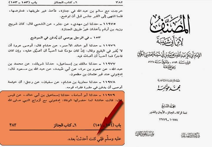 اب آتے ھیں المستدرک علی الصحیحین کی طرف اس کی جلد نمبر 4 اور حدیث نمبر 6796 کامتن اوپر بیان ھو چکا ھے لیکن ایک بار پھر بیان کر دیتے ھیں کہ عائشہ کہ میں نے خود سے بدعتیں ایجاد کی ھیں اور مجھے رسول اللہﷺ اور ابوبکر کے ساتھ نہ دفنایا جائے اور مجھے دوسری ازواجِ رسول اللہ ﷺ کے ساتھ جنت البقیح میں دفنایا جائے