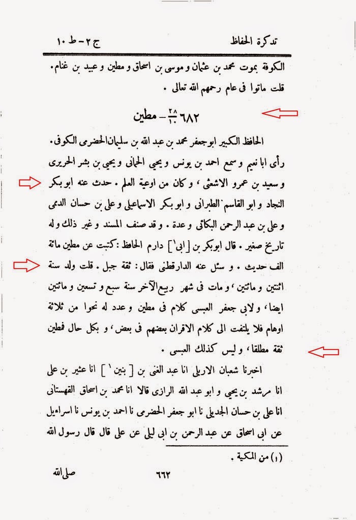 682 مطين الحافظ الكبير أبو جعفر محمد بن عبد الله بن سليمان الحضرمي الكوفى رأى أبا نعيم وسمع أحمد بن يونس ويحيى الحماني ويحيى بن بشر الحريري وسعيد بن عمرو الأشعثى وكان من أوعية العلم حدث عنه أبو بكر النجاد وأبو القاسم الطبراني وأبو بكر الإسماعيلي علي بن حسان الدمي وعلي بن عبد الرحمن البكائي وعدة وقد صنف المسند وغير ذلك وله تاريخ صغير قال أبو بكر بن أبي دارم الحافظ كتبت عن مطين مائة ألف حديث وسئل عنه الدارقطني فقال ثقة جبل قلت ولد سنة اثنتين ومائتين ومات في شهر ربيع الآخر سنة وعدد له نحوا من ثلاثة أوهام فلا يلتفت إلى كلام الأقران بعضهم في بعض وبكل حال فمطين ثقة مطلقا وليس كذلك العبسي.