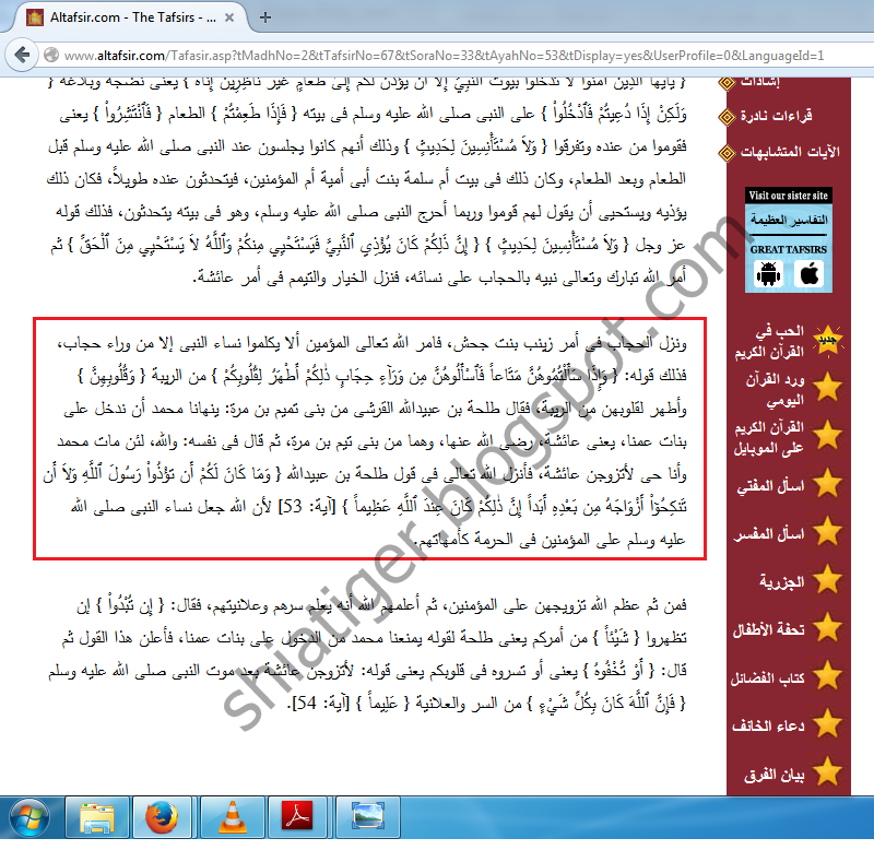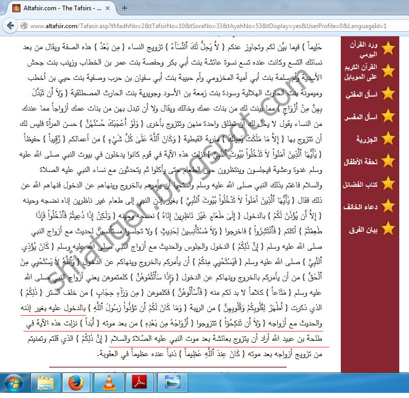 یعنی اور تم کو یہ شایاں نہیں کہ پیغبر خدا ص کو تکلیف دو اور نہ کہ ان کی بیویوں سے کبھی ان کے بعد نکاح کرو بے شک یہ خدا کے نزدیک بڑا گناہ ( کا کام ) ہے
