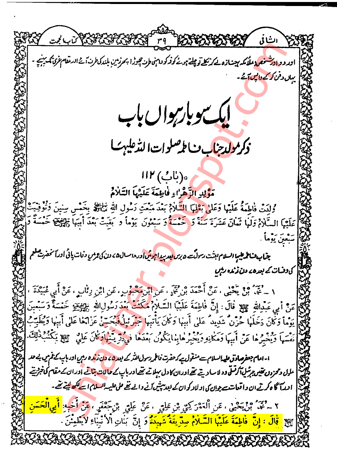 بی بی فاطمہ س شہیدہ ہیں سنی حضرات کثرت جاہلانہ سوال کر کے بی بی فاطمہ س کو شہادت کو افسانہ ثابت کرنے کی ناکام کوشش کرتے ہیں ان کا اکثر مطالبہ ہوتا ہے کہ اصول اربعہ سے بی بی فاطمہ س کی شہادت کا ثبوت دیں اس لئے ایک ثبوت ان کے لئے پیش خدمت ہے امام علی رضا ع نے فرمایا : بی بی فاطمہ س صدیقہ اور شہیدہ ہیں اصول الکافی جلد 1 باب 171 حدیث 2 صفحہ نمبر 291 (عربی ) الشافی ( ترجمہ اصول کافی ) جلد 3 باب 112 حدیث 2 صفحہ 39-40 سند کے راوی 1۔ محمد بن یحیٰ : ثقہ ، عین ( رجال نجاشی راوی 946 صفحہ 353 ) 2۔ العمرکی بن علی: ثقہ ( رجال نجاشی راوی 828 صفحہ 303 ) 3۔ علی بن جعفر :جلیل القدر ثقہ ( الفہرست ابن طوسی راوی 367 صفحہ 87-88 ) مزید علامہ مجلسی نے مراۃ العقول جلد 5 صفحہ 315 پر اس روایت کو صحیح قرار دیا ہے۔