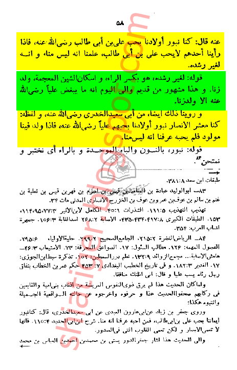 دشمنان علی (ع) کا حرام زادہ ہونا عبادة بن صامت کہتے ہیں: ''کنا نبور اولادنا بحب علی بن ابی طالب (رضی اللہ عنہ)، فاذا راینا احدھم لا یحب علی بن ابی طالب علمنا انہ لیس منا و انہ لغیر رشدة’‘ ۔ ہم اپنے بچوں کو علی ابن ابی طالب (رضی اللہ عنہ) کی محبت کے ذریعہ امتحان کرتے تھے پس جو بھی بچہ پیدا ہوتا تھا اور وہ حضرت علی سے محبت نہیں کرتا تھا تو ہم سمجھ جاتے تھے کہ وہ ہم سے نہیں ہے، اور وہ حلال زادہ پیدا نہیں ہوا ہے حافظ جزری نے اس حدیث کو ذکر کرنے کے بعد لکھا ہے: یہ بات قدیم زمانہ سے آج تک مشہور ہے کہ علی سے فقط زنا زادہ دشمنی کرتا ہے ابو سعید خدری نے کہا ہے : ''کنا معشر الانصار نبور اولادنا بحبھم علیا (رضی اللہ عنہ)، فاذا ولد فینا مولود فلم یحبہ عرفنا انہ لیس منا ۔ ہم انصار اپنے بچوں کو علی (رضی اللہ عنہ) کی محبت کے ذریعہ امتحان کرتے تھے پس جو بھی بچہ پیدا ہوتا تھا اور وہ حضرت علی سے محبت نہیں کرتا تھا تو ہم سمجھ جاتے تھے کہ وہ ہم سے نہیں ہے. اسنی المطالب ص 57-58