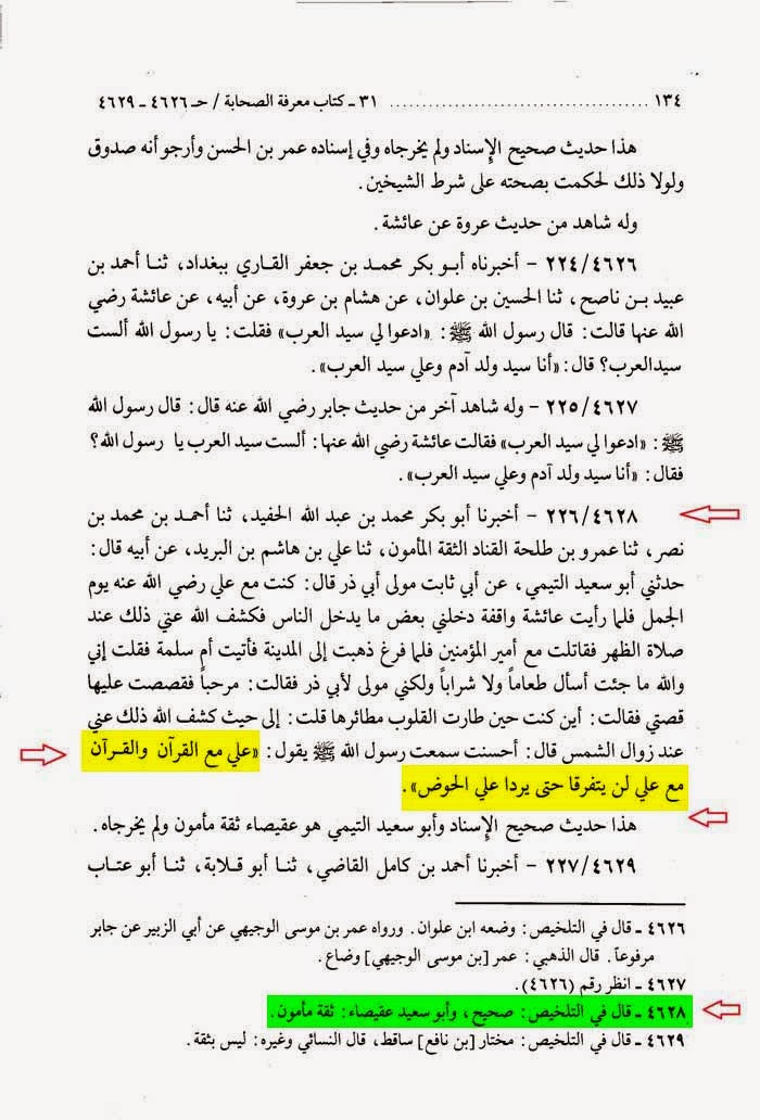 ترجمہ : علی ع قرآن کے ساتھ ہے اور قرآن علی ع کے ساتھ ہے دونوں ایک دوسرے سے کبھی جدا نہیں ہوں گے حتیٰ کہ دونوں حوض کوثر پر پہنچیں گے
