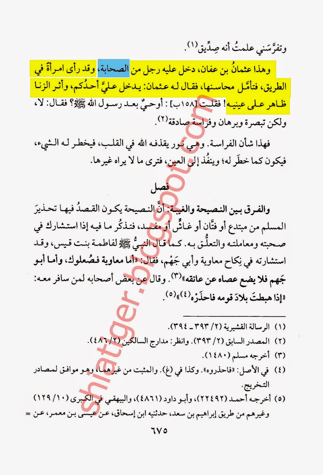 صحابی کی نظروں سے ٹپکتا ہوا زنا عثمان بن عفان ایک محفل میں بیٹھا ہوا تھا اور اس کے ساتھ کوئی عورت بھی تھی، اتنے میں صحابہ میں سے ایک شخص وہاں داخل ہوا اور وہ اس عورت کو ہوس بھری نظروں سے دیکھنے لگا تو اس پر عثمان بن عفان نے اس عورت سے کہا، لو تمہارے پاس ایک ایسا شخص آیا ہے جس کی آنکھوں میں سے نظروں زنا کا اثر آ رہا ہے۔ کتاب الروح المؤلف: ابن القیم الجوزی جلد 1 صفحہ نمبر 675 الناشر: مجمع الفقه الإسلامي بجدة - دار عالم الفوائد