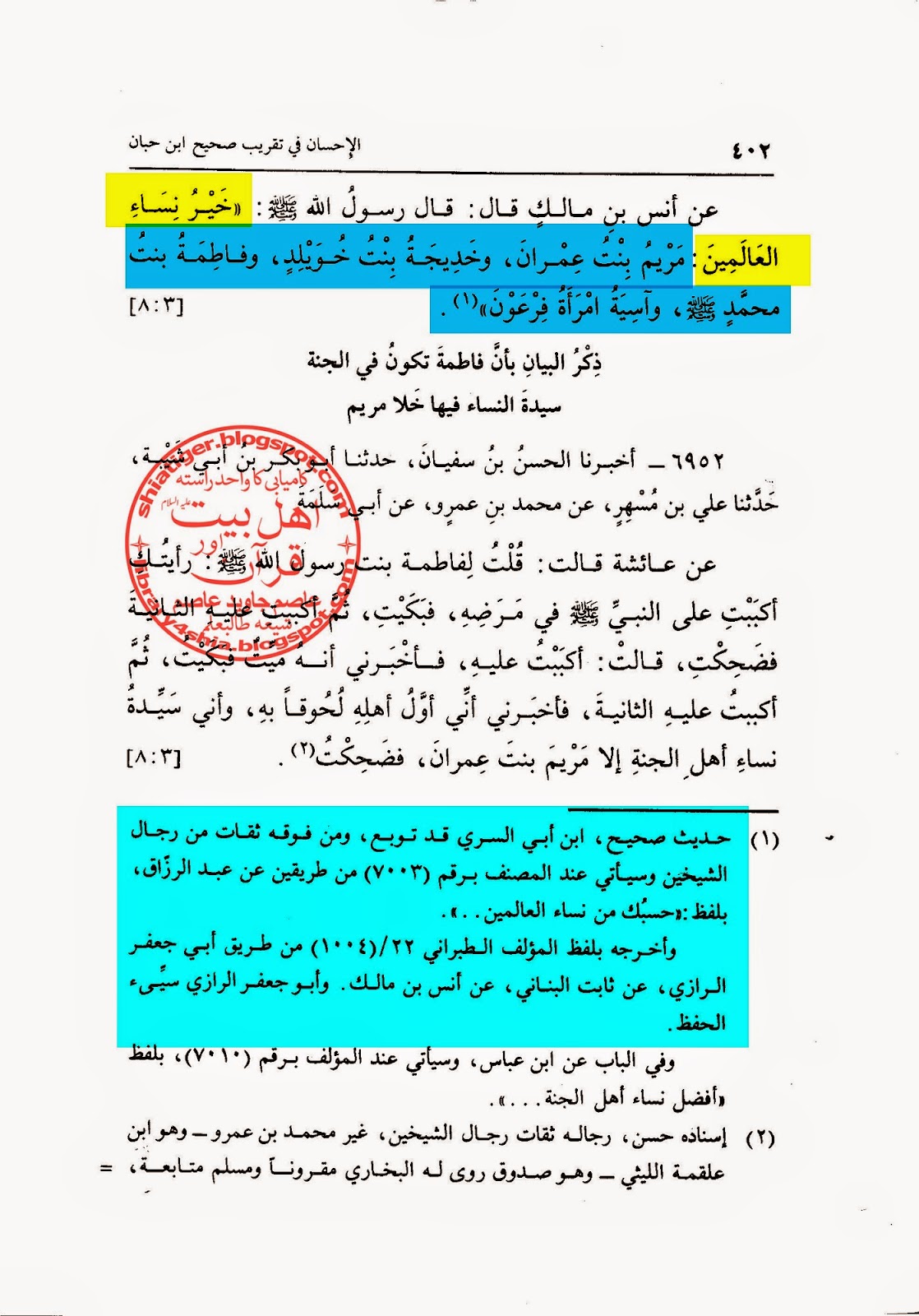 1- خیر النساء العالمین ( الإحسان في تقريب صحيح ابن حبان (ت: الأرناؤوط)، حدیث 6951 ، سند صحیح، المجم الکبیر جلد 22 صفحہ 402 حدیث 1004 )