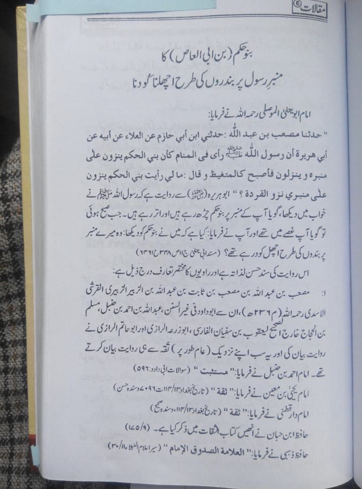 ابو ھریرہ سے روایت کہ رسول اللہ صلی علیہ و آلہ نے خواب میں دیکھا , گویا کہ بنو حکم منبر پر چڑھ رہے ہے اور اتر رہے ہے . جب صبح ہوئی تو گویا آپ غصہ میں تھے اور آپ نے فرمایا : کیا ہے کہ میں نے بنو حکم کو دیکھا , وہ میرے منبر پر بندروں کی طرح اچھل کود رہے تھے - ( مسند ابو یعلیٰ / جلد ١١ / رقم ٦٤٦١ )