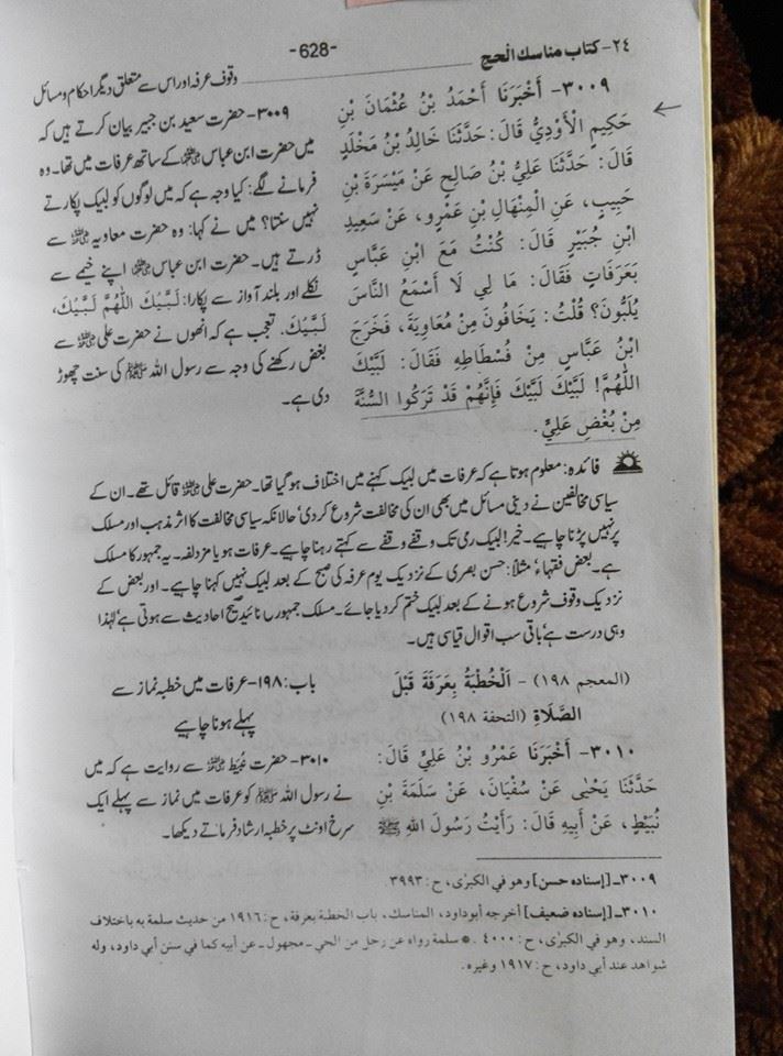 حضرت سعید ابن جبیر بیان کرتے ھیں کہ میں حضرت ابن عباس رضی اللہ عنہ کے ساتھ عرفات میں تھا ' وہ فرمانے لگے : کیا وجہ ھیں کہ لوگوں کو لبیک پکارتے نہیں سنتا ؟ میں نے کہا : وہ معاویہ سے ڈرتے ھیں ' حضرت ابن عباس رضی اللہ عنہ اپنے خیمے سے نکلے اور بلند آواز سے پکارا لبيك اللهم لبيك' لبيك . بے شک ان لوگوں نے حضرت علی علیہ السلام کے بغض میں سنت ( تلبیہ) ترک کیا ھیں