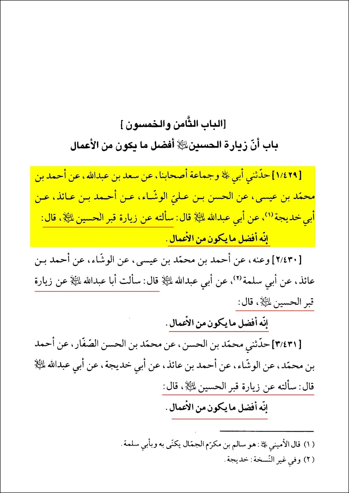 حَدَّثَنِی أَبِی رَحِمَهُ اللَّهُ [ثقة امامی] وَ جَمَاعَةُ أَصْحَابِنَا عَنْ سَعْدِ بْنِ عَبْدِ اللَّهِ [ثقة امامی] عَنْ أَحْمَدَ بْنِ مُحَمَّدِ بْنِ عِیسَى [ثقة امامی] عَنِ الْحَسَنِ بْنِ عَلِیٍّ الْوَشَّاءِ [ثقة امامی] عَنْ أَحْمَدَ بْنِ عَائِذٍ [ثقة امامی] عَنْ أَبِی خَدِیجَةَ [ثقة امامی] عَنْ أَبِی عَبْدِ اللَّهِ ع قَالَ: سَأَلْتُهُ عَنْ زِیَارَةِ قَبْرِ الْحُسَیْنِ ع قَالَ إِنَّهُ أَفْضَلُ مَا یَکُونُ مِنَ الْأَعْمَال‏.