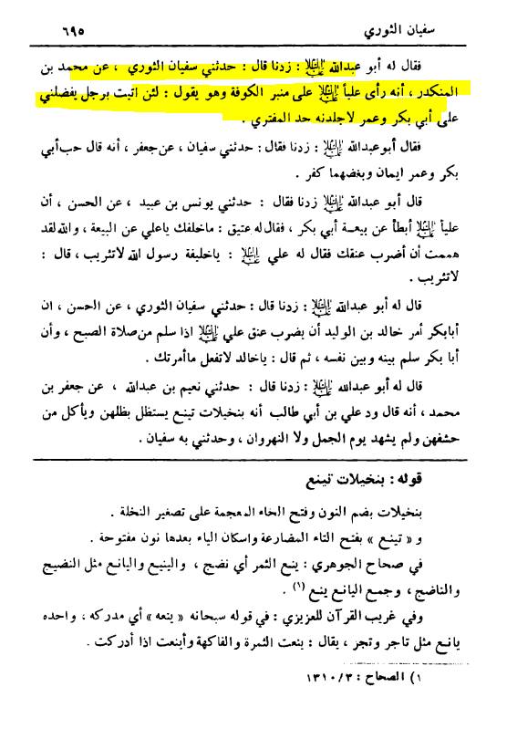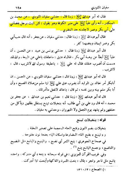 سفیان ثوری نے مجھے روایت کی اس نے محمد بن منکدر سے کہ اس نے علی ع کو منبر کوفہ پر دیکھا اور امیر المؤمنین ع نے کہا اگر میرے پاس ایک شخص لائے جائے جو مجھے ابوبکر اور عمر پر فضیلت دے تو میں اس کو ضرور درے لگاؤں گا جو کہ مفتری کی حد ہے۔